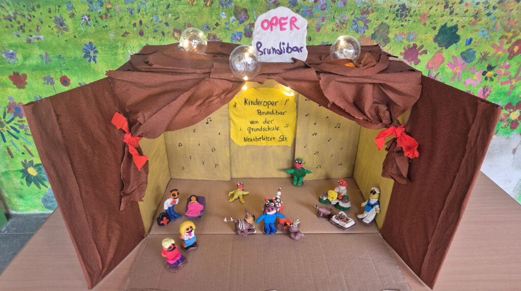 Begleitet von der Musiklehrerin Frau Bidlingmeier proben die zweiten und die dritten Klassen schon seit vielen Wochen im Musikunterricht für die Aufführung der Kinderoper “Brundibar” von Hans Krasa. Sie singen geeignete Opernausschnitte, tanzen und agieren szenisch, um eine vielsinnige Anregung zu ermöglichen. Darüber hinaus werden Requisiten, Kostüme und andere Objekte gebastelt und eingesetzt.