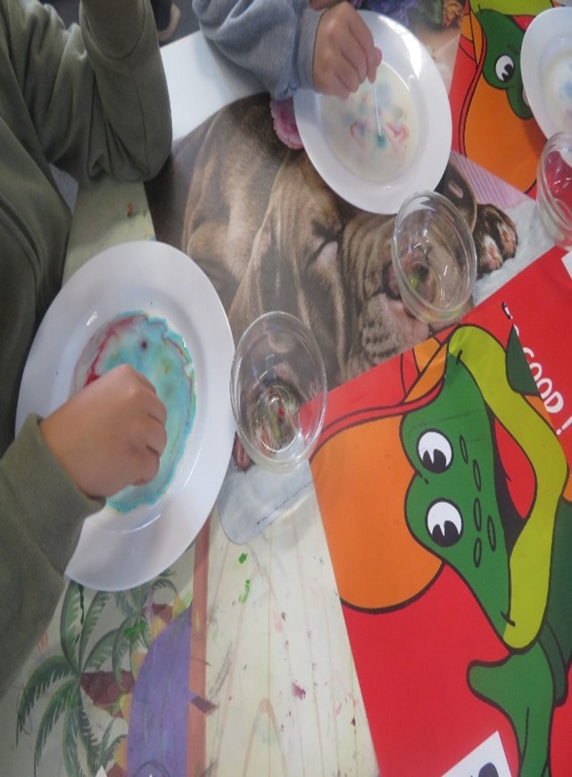 Zum Thema Farben haben wir das Experiment „Das wandernde Wasser” durchgeführt. Die Kinder staunten darüber wie das bunte Wasser von Glas zu Glas wanderte. Dabei haben wir uns über Grundfarben unterhalten. Dieses Thema wurde mit „Milchbildern” abgeschlossen .
