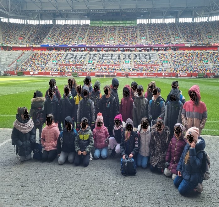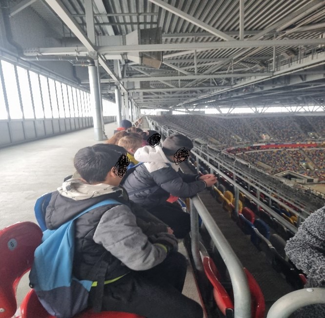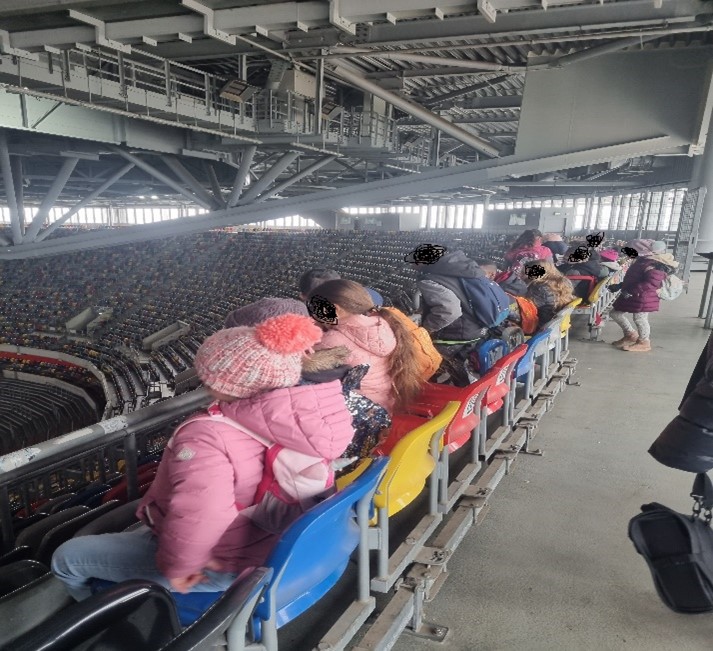 Es gab eine gelungene Führung durch die Arena, bei der die Kinder viele interessante Fragen an den Führungsleiter stellten. Es entstand ein reger Austausch über Mannschaften und Spieler aus aller Welt. Sie durften sich auf die Sitze der Spieler auf der Reservebank setzen. So waren sie in der Lage sich in die Rollen berühmter Fußballer zu versetzen. Zum Glück unserer Kinder waren sie in einem seltenen Moment im Stadion, nämlich als das Arenadach geschlossen wurde. Der Führungsleiter erklärte, dass ein Schließen nur in seltenen Fällen vollzogen wird, da es immense Kosten aufwirft und versetzte die Kinder in einen Schock als er die Summe erwähnte. Es war eine besondere Erfahrung die Arena aus jedem Winkel und jeder Perspektive erkunden zu dürfen; mal standen wir am Rand des Feldes und mal an der obersten Reihe und uns lag das Stadion zu Füßen.