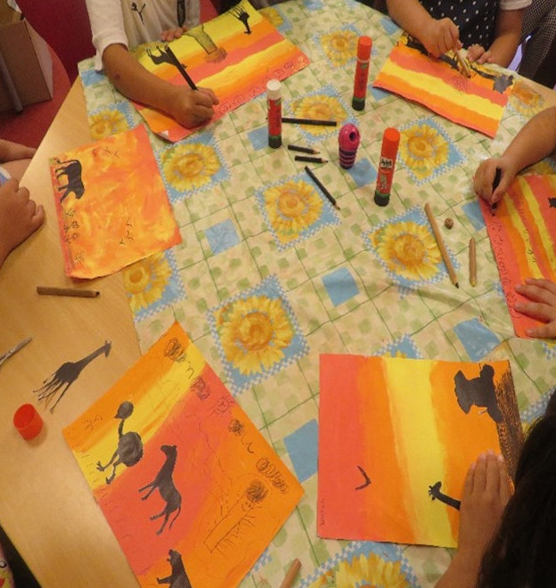 Im Verlauf der Woche stellten die Kinder afrikanische Instrumente (Trommeln und Rasseln), afrikanischen Schmuck aus Federn und Perlen her und gestalteten tolle Schattenbilder von Löwen, Giraffen, Elefanten und vielen mehr.
