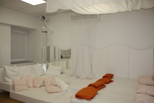 Mit einem großen Wasserbett unter dem sich eine Bass box befindet, die Musik über das Wasserbett an den Körper, der darauf liegt, weitergibt und faszinierende verschiedene Lichtinstallationen sowie eine Wassersäule.