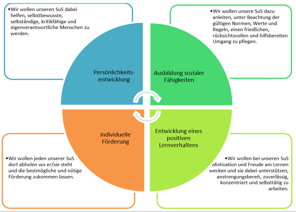 Unsere Schülerinnen und Schüler sollen nach dem Grundsatz „Stärken stärken – Schwächen mindern“ ein tragfähiges Fundament für lebenslanges Lernen erhalten, angelehnt an ihren individuellen Lebensvoraussetzungen.